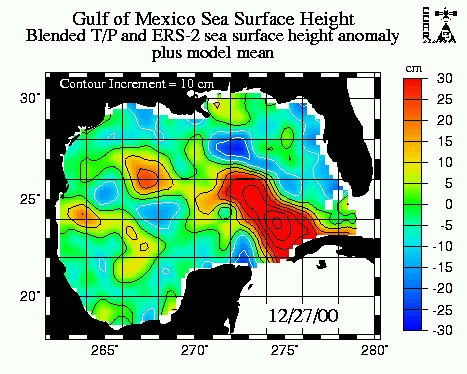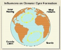 currents: Coriolis force piles water up in center of gyre; sea surface