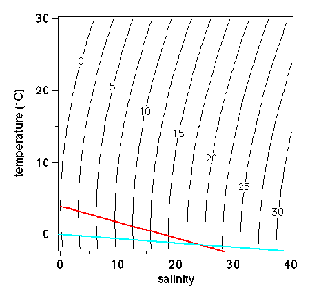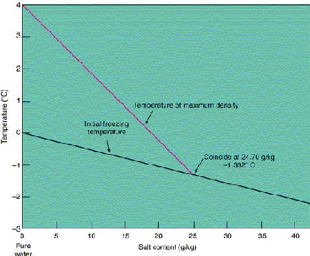 at 3.98°C = 1.0 g/cm-3;avg salinity water = 1.0278 g/cm-3