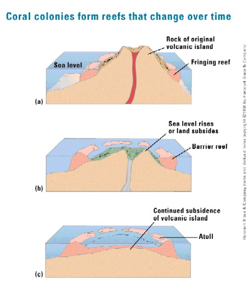 Reef: if land sinks and corals grow upwards,