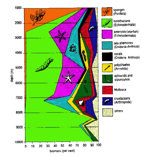star fish are dominant below 2000 m with holothurian dominance increasing