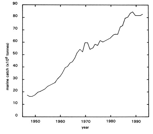 all fishgrounds (70%, FAO) are overfished: the catch-per-unit-effort decreases