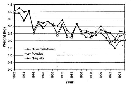 Decrease of average weight of coho salmon in three estuaries in Puget