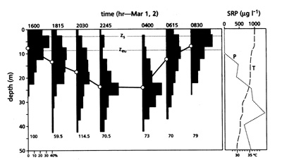 and larger flagellates: migrate towards deeper water during night to assimilate