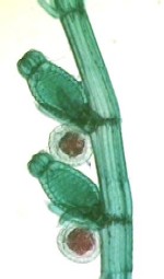 Oogonia (elongated) and antheridia (round) can occur